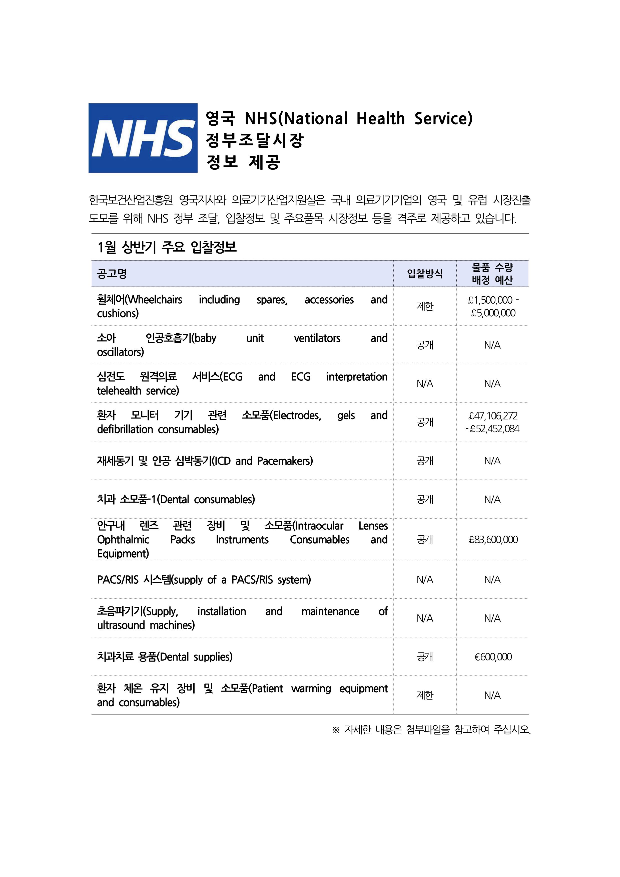영국 NHS 정부조달시장 정보 제공 (1월 상반기) 영국 NHS 정부조달시장 정보 제공 (1월 상반기) : 작성자, 작성일, 조회수, 첨부파일 정보 제공 작성자 박지연 작성일 2015-02-17 조회수 8,958 첨부파일 입찰종류에 따른 조달절차.pdf(653.25KB)내려받기 서비스 분류에 따른 공지.pdf(34.33KB)내려받기 PQQ,ITT예시.pdf(625.46KB)내려받기 3.NHS 입찰 품목별 트렌드.pdf(533.75KB)내려받기 2.NHS 입찰절차 가이드라인.pdf(457.98KB)내려받기 1.NHS 개혁동향 및 조달방식의 변화.pdf(3.15MB)내려받기 Tendersdirct_2015년1월호(상).pdf(955.49KB)내려받기