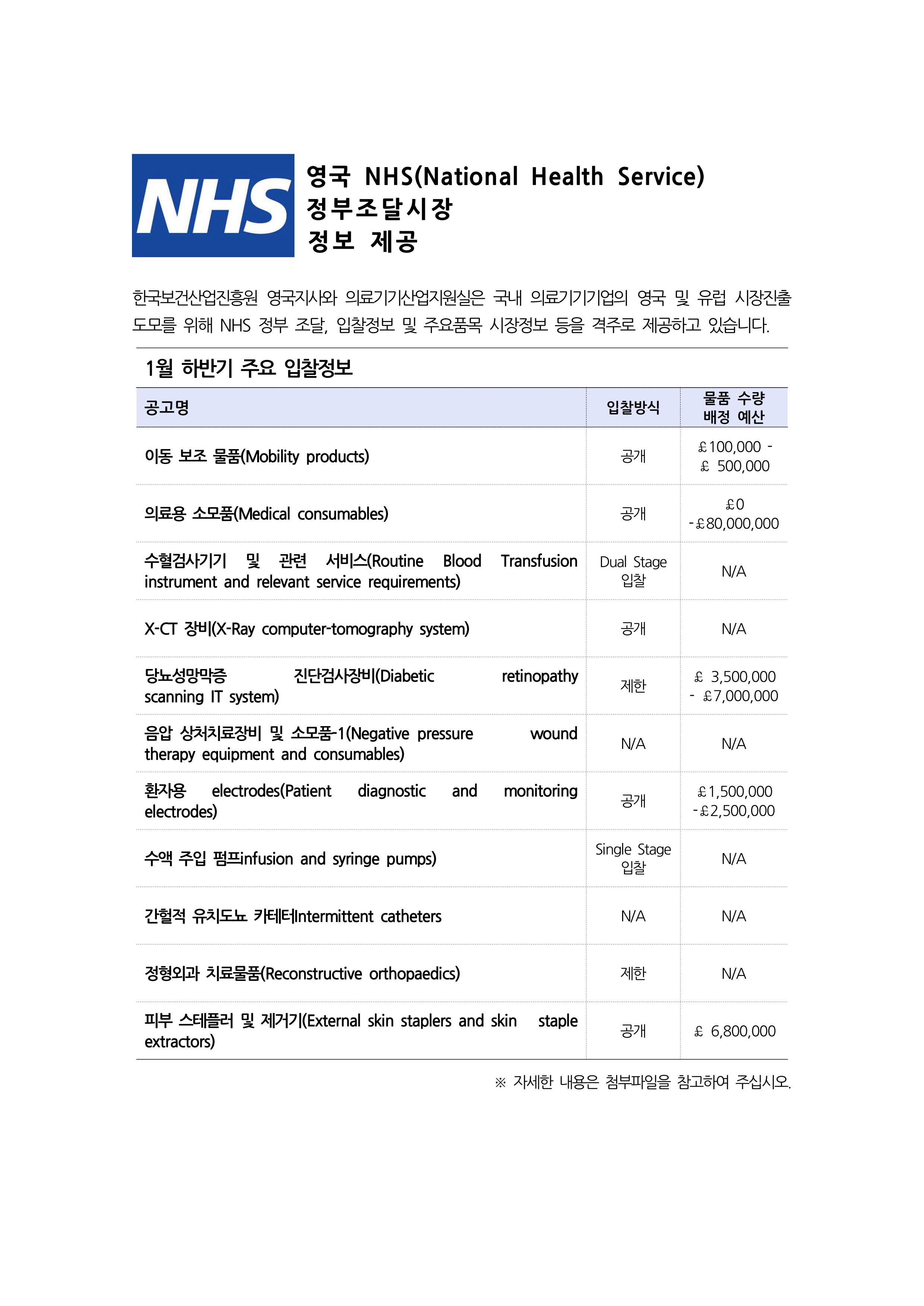 영국 NHS 정부조달시장 정보 제공 (1월 하반기) 영국 NHS 정부조달시장 정보 제공 (1월 하반기) : 작성자, 작성일, 조회수, 첨부파일 정보 제공 작성자 박지연 작성일 2015-02-17 조회수 8,587 첨부파일 입찰종류에 따른 조달절차.pdf(653.25KB)내려받기 서비스 분류에 따른 공지.pdf(34.33KB)내려받기 PQQ,ITT예시.pdf(625.46KB)내려받기 3.NHS 입찰 품목별 트렌드.pdf(533.75KB)내려받기 2.NHS 입찰절차 가이드라인.pdf(457.98KB)내려받기 1.NHS 개혁동향 및 조달방식의 변화.pdf(3.15MB)내려받기 Tendersdirct_2015년1월호(하).pdf(934.1KB)내려받기