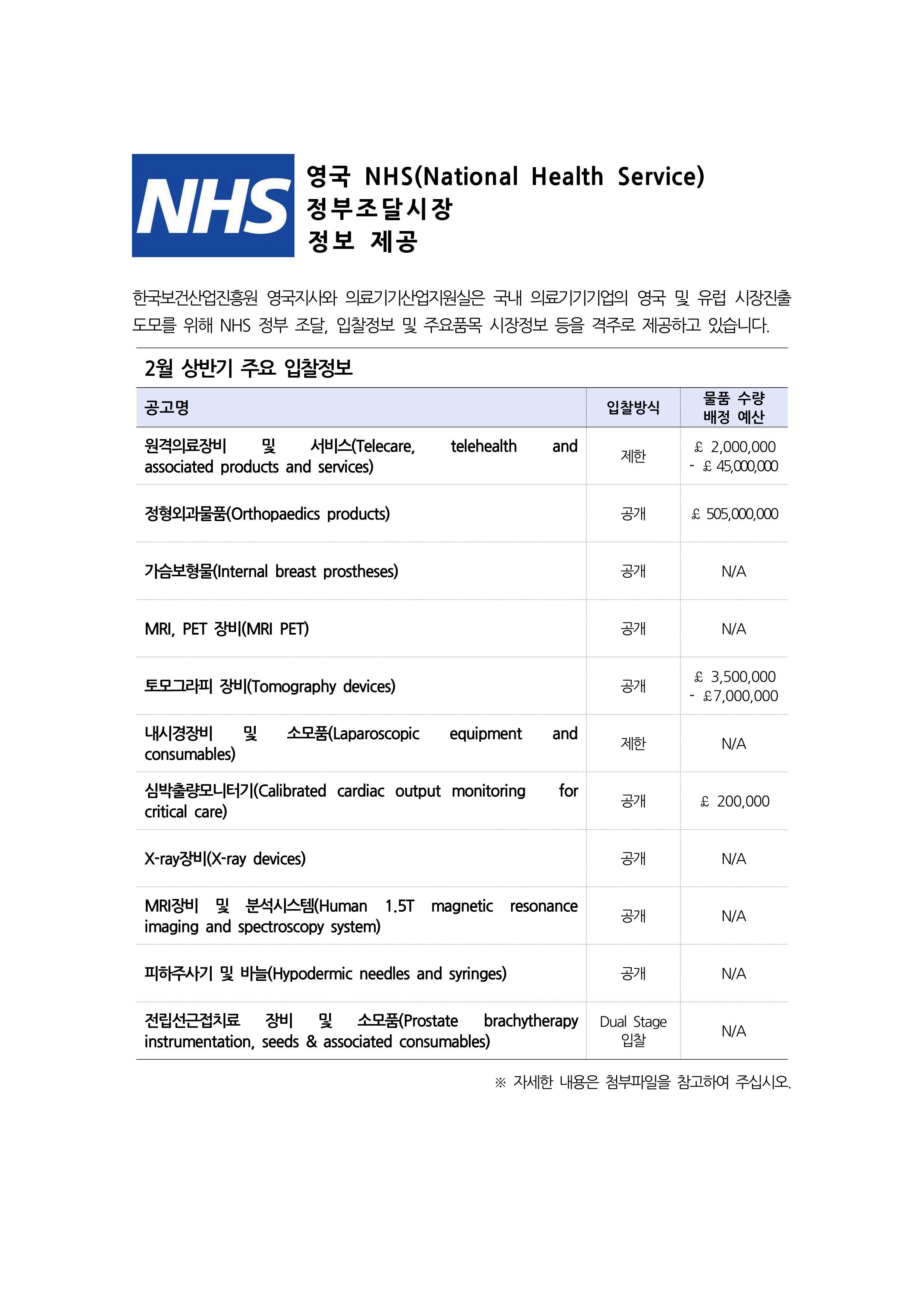 영국 NHS 정부조달시장 정보 제공 (2월 상반기) 영국 NHS 정부조달시장 정보 제공 (2월 상반기) : 작성자, 작성일, 조회수, 첨부파일 정보 제공 작성자 박지연 작성일 2015-02-17 조회수 8,841 첨부파일 입찰종류에 따른 조달절차.pdf(653.25KB)내려받기 서비스 분류에 따른 공지.pdf(34.33KB)내려받기 PQQ,ITT예시.pdf(625.46KB)내려받기 3.NHS 입찰 품목별 트렌드.pdf(533.75KB)내려받기 2.NHS 입찰절차 가이드라인.pdf(457.98KB)내려받기 1.NHS 개혁동향 및 조달방식의 변화.pdf(3.15MB)내려받기 Tendersdirct_2015년2월호(상).pdf(928.35KB)내려받기