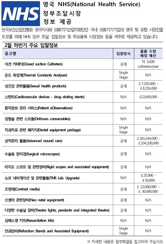 영국 NHS 정부조달시장 정보제공 (2월 하반기) 영국 NHS 정부조달시장 정보제공 (2월 하반기) : 작성자, 작성일, 조회수, 첨부파일 정보 제공 작성자 관리자 작성일 2016-02-29 조회수 8,701 첨부파일 Tenders Direct_2(하).pdf(858.43KB)내려받기 ※ 아래의 자료를 확인 하시려면 클릭해주시기 바랍니다. 1. NHS 개혁동향 및 조달방식의 변화 2. NHS 입찰절차 가이드라인 3. NHS 입찰 품목별 트렌드 4. PQQ.ITT 예시 5. 서비스 분류에 따른 공지 6. 입찰종류에 따른 조달절차