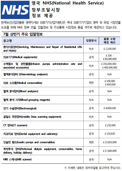 영국 NHS 정부조달시장 정보제공 (7월 상반기) 영국 NHS 정부조달시장 정보제공 (7월 상반기) : 작성자, 작성일, 조회수, 첨부파일 정보 제공 작성자 관리자 작성일 2016-07-15 조회수 10,762 첨부파일 Tenders Direct_7(상).pdf(739.86KB)내려받기 ※ 아래의 자료를 확인 하시려면 클릭해주시기 바랍니다. 1. NHS 개혁동향 및 조달방식의 변화 2. NHS 입찰절차 가이드라인 3. NHS 입찰 품목별 트렌드 4. PQQ.ITT 예시 5. 서비스 분류에 따른 공지 6. 입찰종류에 따른 조달절차