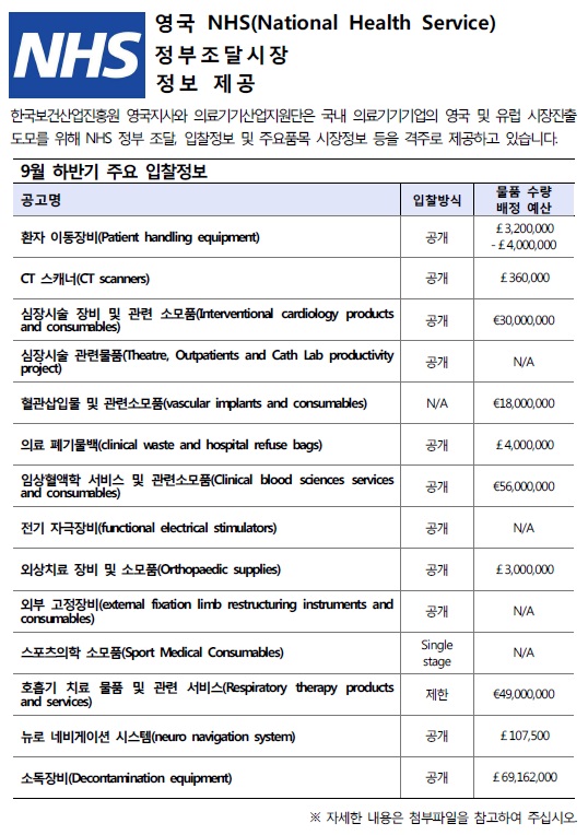 [NHS입찰정보] 영국 NHS 정부조달시장 정보제공 (9월 하반기) [NHS입찰정보] 영국 NHS 정부조달시장 정보제공 (9월 하반기) : 작성자, 작성일, 조회수, 첨부파일 정보 제공 작성자 관리자 작성일 2016-09-27 조회수 7,485 첨부파일 Tenders Direct_9(하).pdf(629.26KB)내려받기 ※ 아래의 자료를 확인 하시려면 클릭해주시기 바랍니다. 1. NHS 개혁동향 및 조달방식의 변화 2. NHS 입찰절차 가이드라인 3. NHS 입찰 품목별 트렌드 4. PQQ.ITT 예시 5. 서비스 분류에 따른 공지 6. 입찰종류에 따른 조달절차