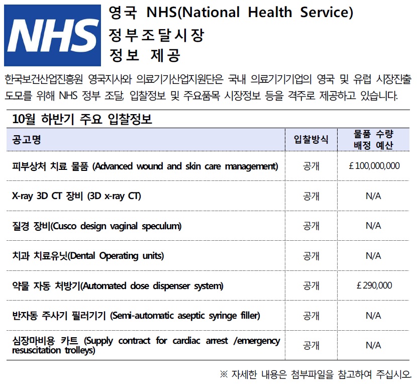 [NHS입찰정보] 영국 NHS 정부조달시장 정보제공 (10월 하반기) [NHS입찰정보] 영국 NHS 정부조달시장 정보제공 (10월 하반기) : 작성자, 등록일, 조회수, 첨부파일 정보 제공 작성자 관리자 등록일 2016-11-03 조회수 5,177 첨부파일 Tenders Direct_10(하).pdf(788.71KB)내려받기 ※ 아래의 자료를 확인 하시려면 클릭해주시기 바랍니다. 1. NHS 개혁동향 및 조달방식의 변화 2. NHS 입찰절차 가이드라인 3. NHS 입찰 품목별 트렌드 4. PQQ.ITT 예시 5. 서비스 분류에 따른 공지 6. 입찰종류에 따른 조달절차