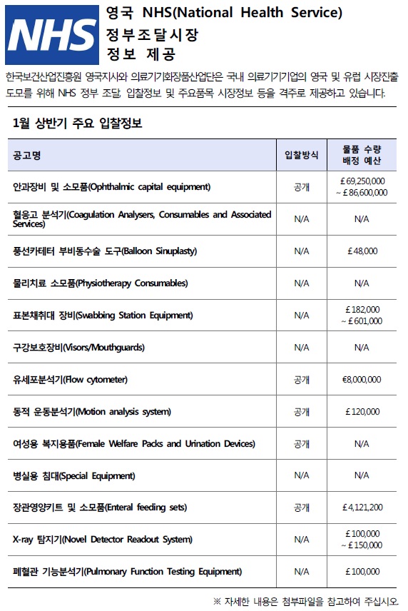 [NHS입찰정보] 영국 NHS 정부조달시장 정보제공 (1월 상반기) [NHS입찰정보] 영국 NHS 정부조달시장 정보제공 (1월 상반기) : 작성자, 등록일, 조회수, 첨부파일 정보 제공 작성자 관리자 등록일 2017-01-17 조회수 7,110 첨부파일 Tenders Direct_1(상)_2017.pdf(643.88KB)내려받기 ※ 아래의 자료를 확인 하시려면 클릭해주시기 바랍니다. 1. NHS 개혁동향 및 조달방식의 변화 2. NHS 입찰절차 가이드라인 3. NHS 입찰 품목별 트렌드 4. PQQ.ITT 예시 5. 서비스 분류에 따른 공지 6. 입찰종류에 따른 조달절차