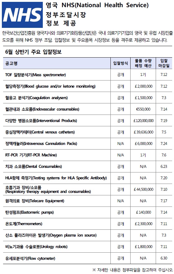 (6월 상반기) [NHS입찰정보] 영국 NHS 정부조달시장 정보제공 (6월 상반기) [NHS입찰정보] 영국 NHS 정부조달시장 정보제공 : 작성자, 등록일, 조회수, 정보 제공 작성자 관리자 등록일 2017-06-20 조회수 4,975 ※ 아래의 자료를 확인 하시려면 클릭해주시기 바랍니다. 1. NHS 개혁동향 및 조달방식의 변화 2. NHS 입찰절차 가이드라인 3. NHS 입찰 품목별 트렌드 4. PQQ.ITT 예시 5. 서비스 분류에 따른 공지 6. 입찰종류에 따른 조달절차