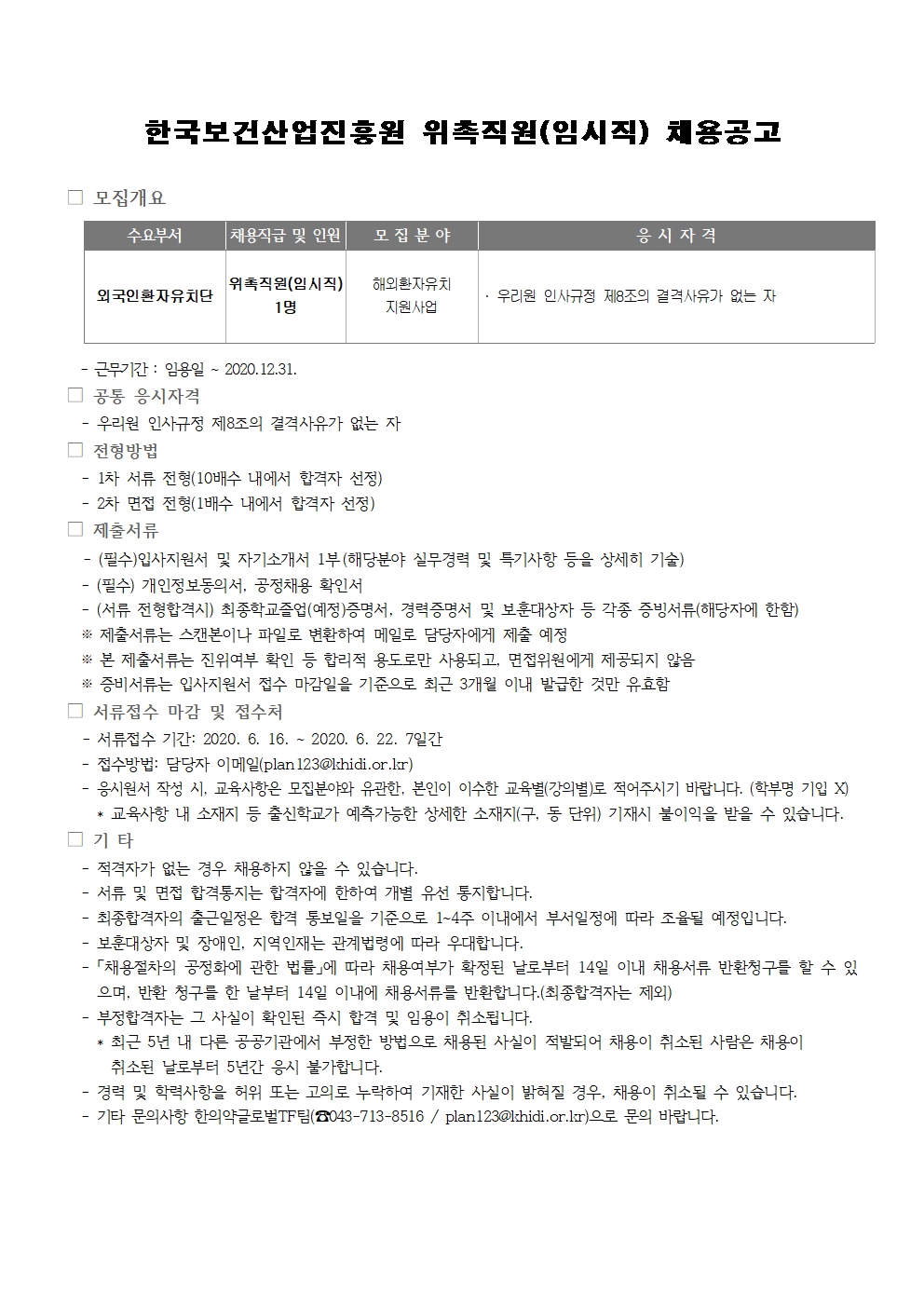 한국보건산업진흥원 위촉직원(임시직) 채용공고