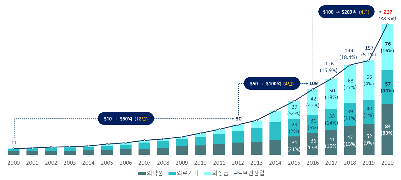 * 보건산업 수출액: 11억 달러(’00) → 50억 달러(’12) → 109억 달러(’16) → 217억 달러(’20)