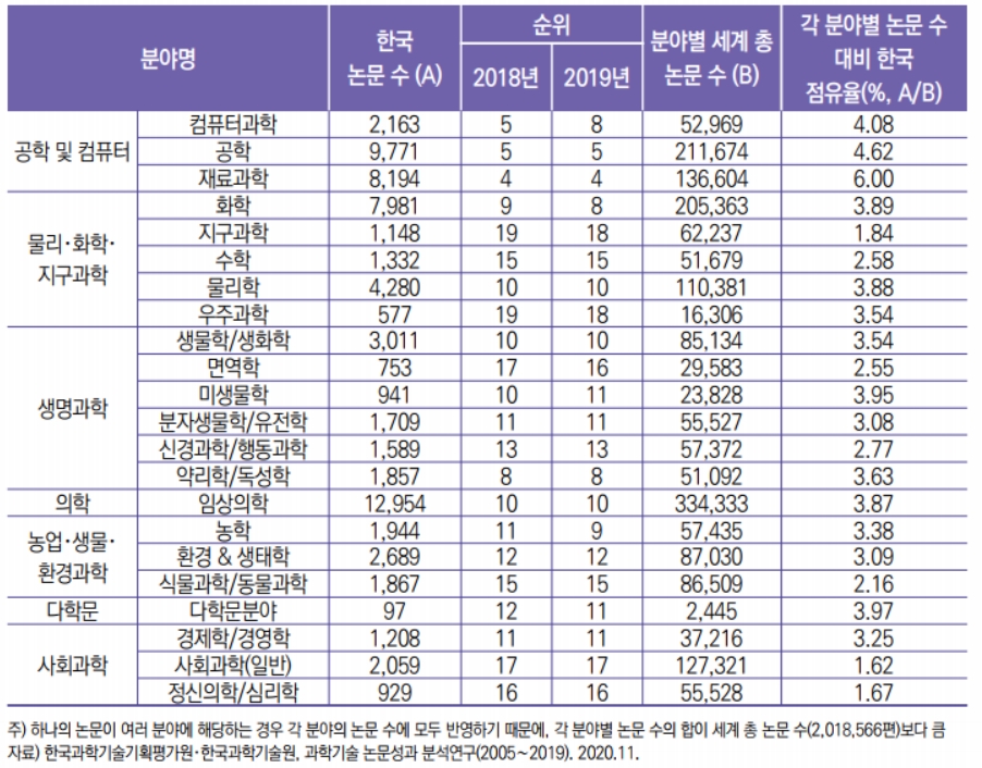 한국은 총 22개 분야 모두 상위 20위권 안에 속하고 있으며 그중 9개 분야(임상의학, 약리학, 독성학, 생화학 등)가 상위 10위권 내에 있다.