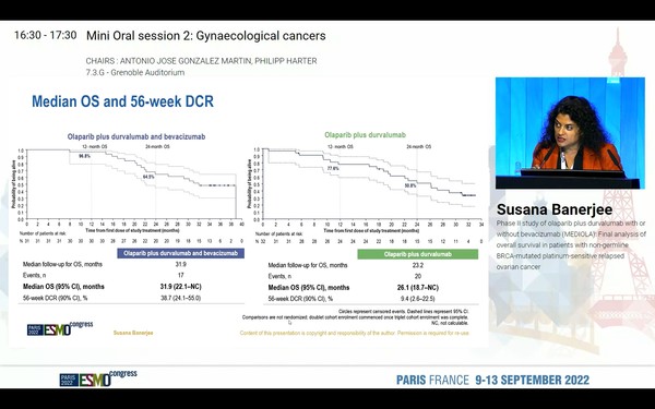 11일, 유럽종양학회 연례학술회의(ESMO 2022)에서는 비(非)생식선 BRCA변이 백금감수성 재발 난소암 환자 63명을 대상으로 린파자와 임핀지, 아바스틴 3제요법과 린파자와 임핀지 2제 요법을 평가한 MEDIOLA 임상 2상의 최종 분석 결과가 공개됐다.