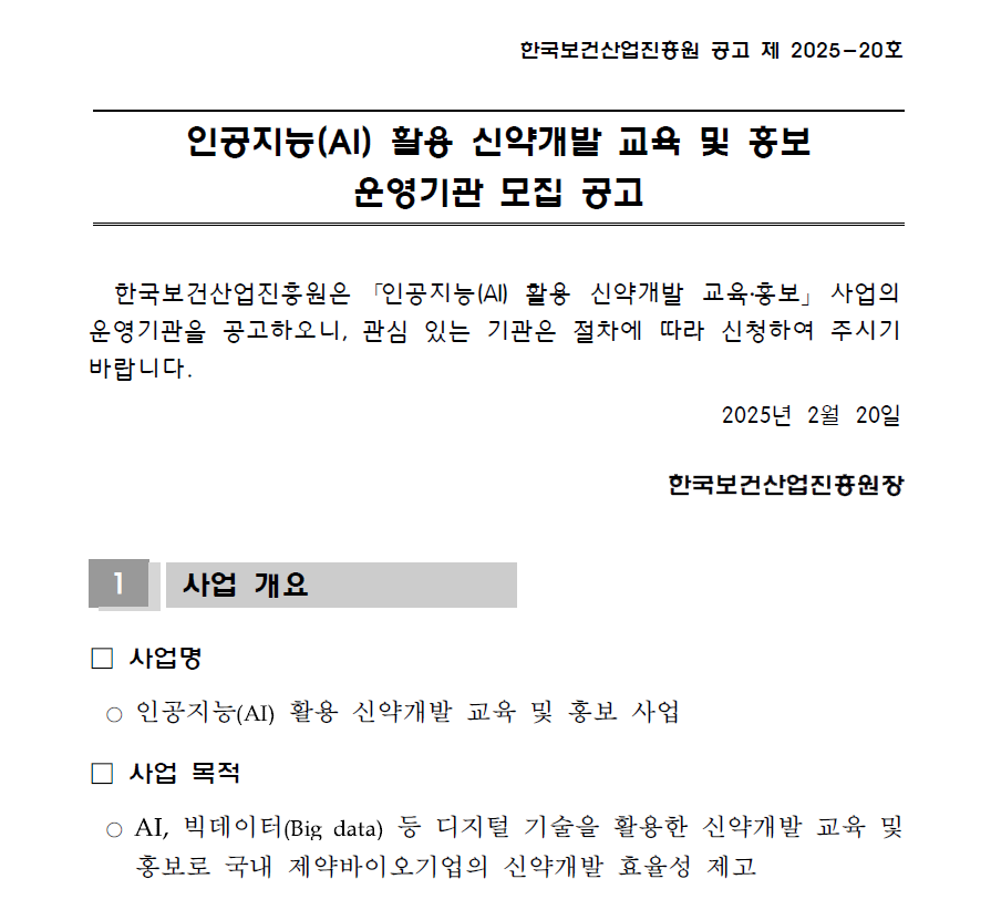 2025년 인공지능(AI) 활용 신약개발 교육 및 홍보 사업 운영기관 모집 공고