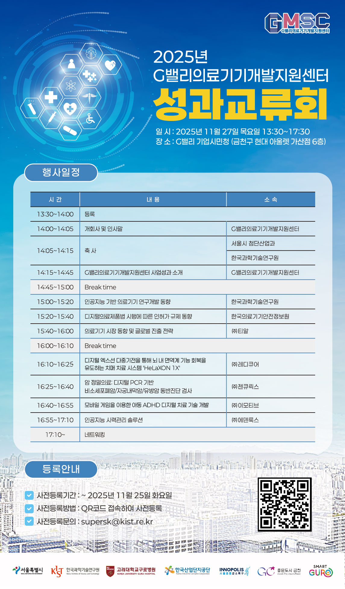 G밸리의료기기개발지원센터는 2025년 11월 27일(목), 서울시 금천구 기업시민청에서 2025년 성과교류회를 개최합니다.