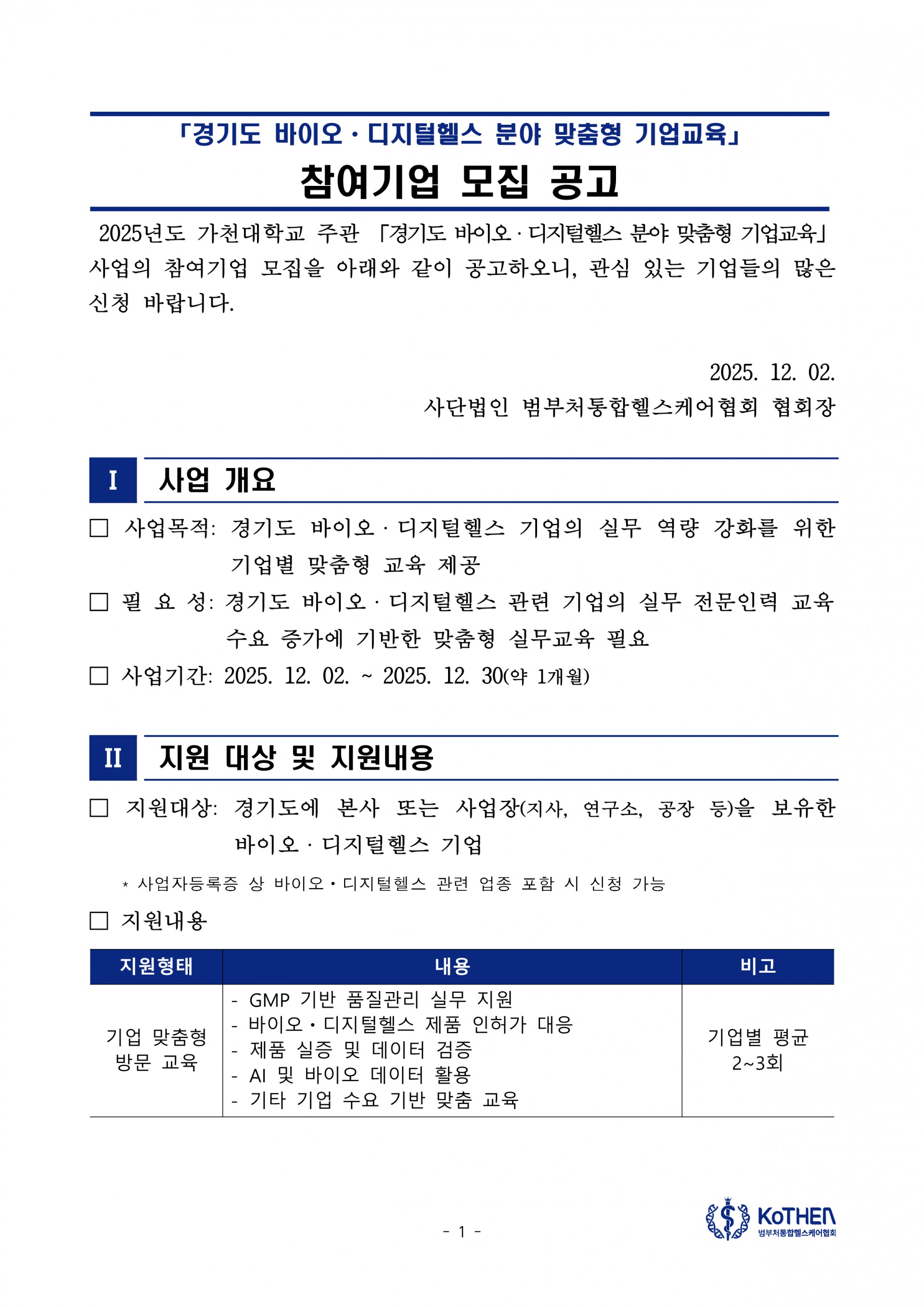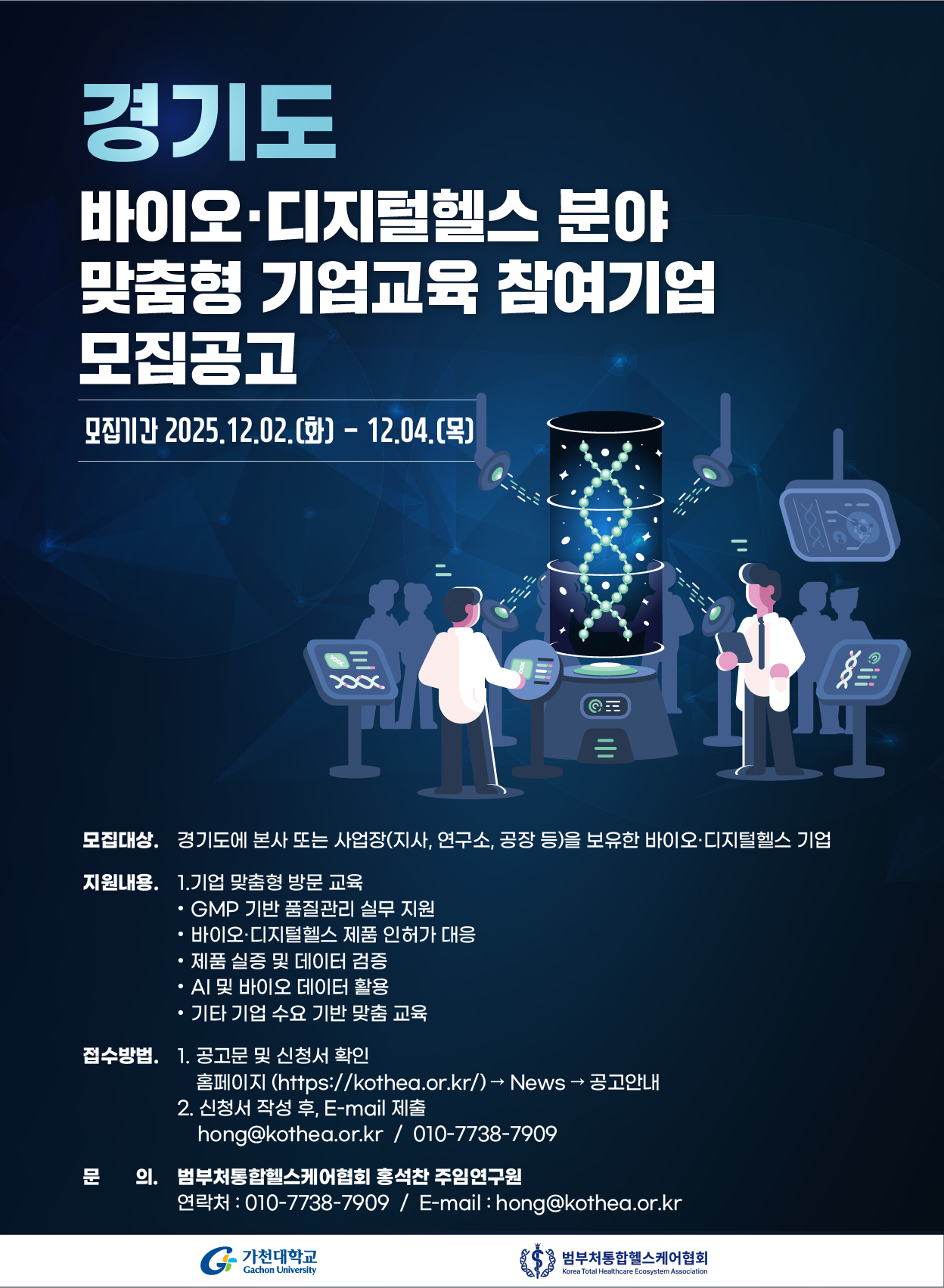 모집공고[KoTHEA] 경기도 바이오ㆍ디지털헬스분야 맞춤형 기업교육 참여기업 모집(12/4까지)