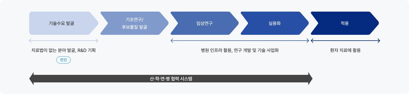 병원이 보건의료기술혁신(HT Innovation)의 중심주체가 되어 “R&D - 중개․임상연구 - 사업화 - 제품개발 - 진료”에 이르는 선순환체계를 확립하여 의료서비스 고도화 및 의료 질 향상을 실현하는 병원