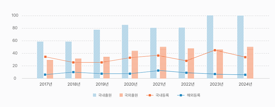 지식재산권 출원 (등록) 현황 - 구분, 2022년, 2023년, 2024년 구분 2022년 2023년 2024년 국내출원 81건 102건 101건 국외출원 57건 54건 59건 국내등록 29건 47건 35건 해외등록 9건 7건 6건