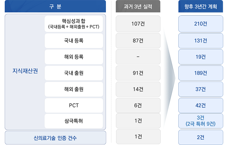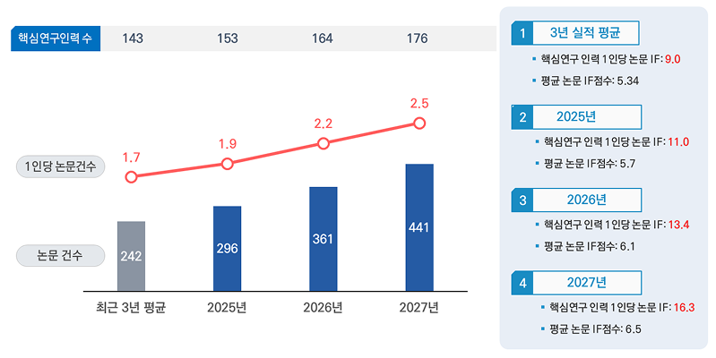 논문 - 구분, 최근 3년 평균, 2025년, 2026년, 2027년 구분 최근 3년 평균 2025년 2026년 2027년 핵심연구인력 수 143 153 164 176 1인당 논문건수 1.7 1.9 2.2 2.5 논문 건수 242 296 361 441 -