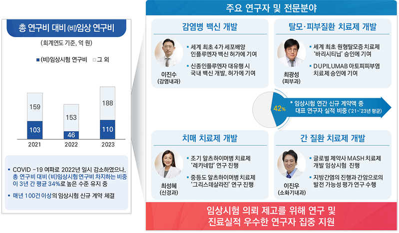 총 연구비 대비 (비)임상 연구비(회계연도 기준, 억 원) - 구분, 2021, 2022, 2023 구분 2021 2022 2023 (비)임상시험 연구비 103 46 110 그 외 159 153 188 - COVID -19 여파로 2022년 일시 감소하였으나, 총 연구비 대비 (비)임상시험 연구비 차지하는 비중이 3년 간 평균 34%로 높은 수준 유지 중