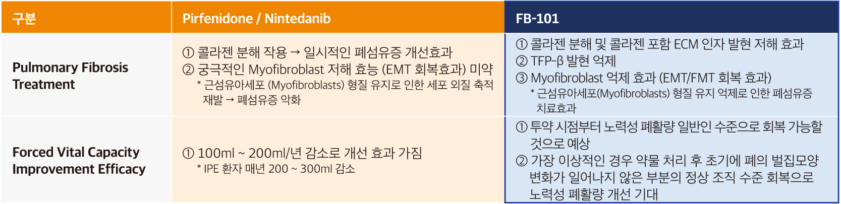 현재 시판 중인 허가의약품 피르페니돈(로슈)과 닌테다닙(베링거인겔하임)은 질병의 진행 억제 또는 지연 효과만을 보이며, 복용 시 부작용이 발생하여 약제 용량 증가를 통한 효능 향상이 불가능하다. 그 외 주요 유발 인자인 TGF-β 하위 표적 대상의 임상 2/3상 진입 개발 약물들로 궁극적인 작용기전은 콜라겐 분해에 따른 단순 병증 완화에 있으며, 이에 낮은 부작용 및 가역적 치료 효과를 가진 치료제 개발의 의학적 미충족 수요가 높은 현실이다. 주식회사 FNCT Biotech의 폐섬유증 치료제 ‘FB-101’은 부작용을 최소화한 인간 항체 기반의 치료제이며, 현재 임상 개발 중인 약물의 대상 표적들을 발현 및 활성을 조절하는 신규 표적에 대한 약물로써 단순 병증 완화가 아닌 뚜렷한 폐섬유증의 발생 억제 및 가역적 치료 효과가 예상된다.