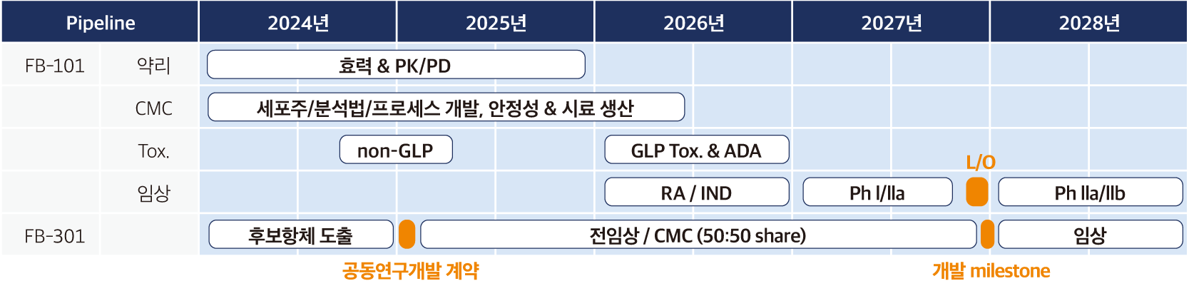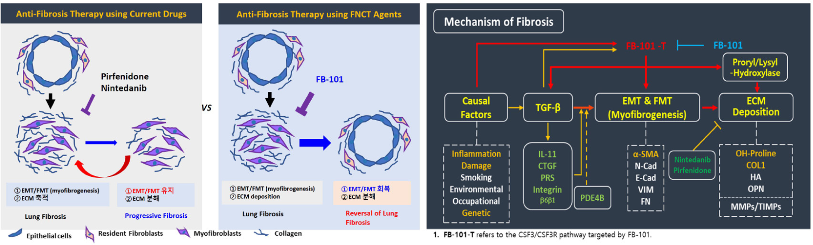 주식회사 FNCT Biotech은 저분자 물질 대비 안전성이 확보된 인간 단일클론항체 기반의 폐섬유증 관련 신규 상위 조절 표적 CSF3에 대한 First-in-class 폐섬유증 치료제 ‘FB-101’을 개발했다. 폐섬유증 동물모델을 이용하여 신규 MoA 확립 및 뚜렷한 치료 효능을 확인하고 비임상 및 임상 시료 생산 (CMC)과정을 진행중이다. 향후 FB-101은 새로운 패러다임의 폐섬유증 치료제가 될 것으로 기대된다.